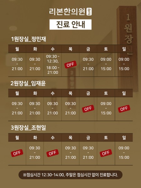 상호 : 광교리본한의원 | 대표자 : 정민재 | 사업자등록번호 : 248-92-01421 | 개인정보관리책임자 : 정민재